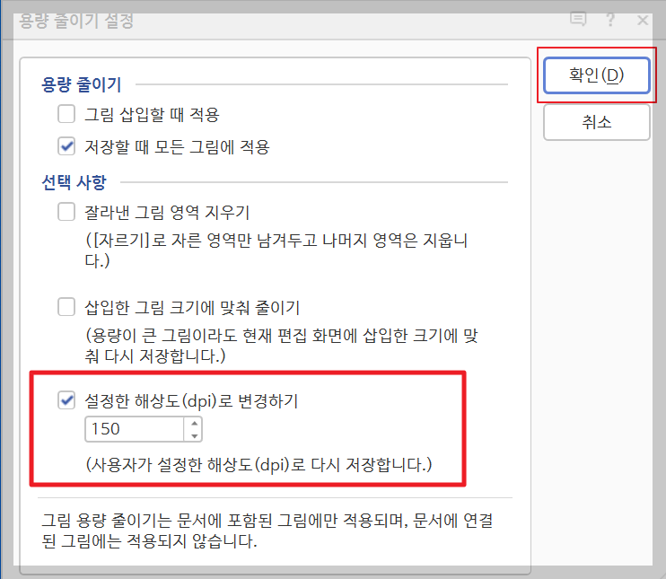 한글 프로그램에서는 별도의 기능으로 이미지를 자동 최적화할 수 있습니다.